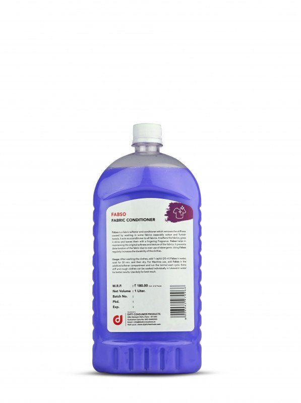 Fabso is a fabric softener and conditioner which removes the stiffness caused by washing in some fabrics especially cotton and Turkish towels. It acts as a conditioner to all fabrics. It softens the fabrics, gives it shine and leaves them with a lingering Fragrance. Fabso helps in maintaining the original softness and texture of the fabrics. It prevents deterioration of the fabric due to over use of detergents. Using Fabso regularly increases the durability of the clothes.