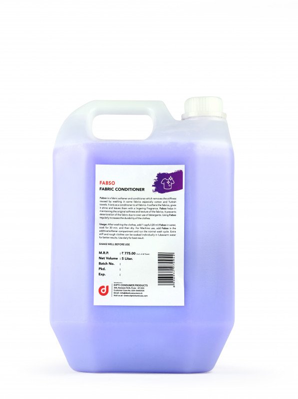 Fabso is a fabric softener and conditioner which removes the stiffness caused by washing in some fabrics especially cotton and Turkish towels. It acts as a conditioner to all fabrics. It softens the fabrics, gives it shine and leaves them with a lingering Fragrance. Fabso helps in maintaining the original softness and texture of the fabrics. It prevents deterioration of the fabric due to over use of detergents. Using Fabso regularly increases the durability of the clothes.