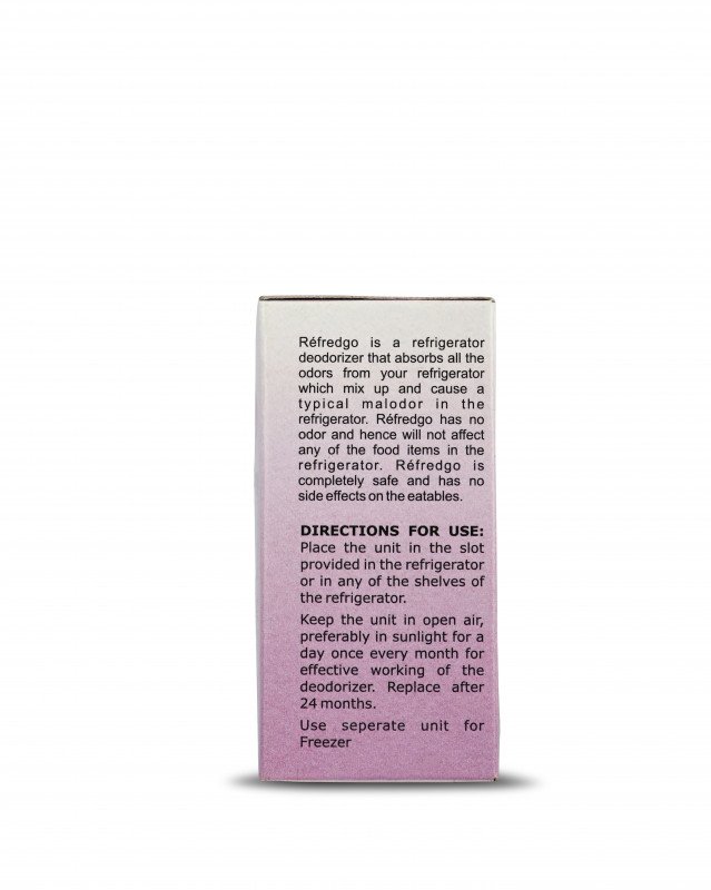 Refredgo is a refrigerator deodorizer that absorbs all the odors from the refrigerator which mix up and causes a typical malodor in the refrigerator. Refredgo has no odor of itself and hence will not affect any food item in the refrigerator. Refredgo is completely safe and has no side effects on the eatables.